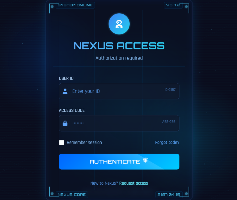 Features a futuristic UI with cursor-responsive animations, AES-style access field, and smooth user experience. Perfect for portfolios, sci-fi themed projects, or web app frontends.